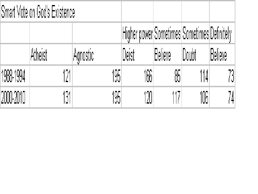 A value above 100 implies that the intelligent favor the alternative more than do the unintelligent and a value of less than 100 implies the opposite. One can see that while the Stupid Vote is for Belief in God the Smart Vote is for Agnosticism – the view that the existence or non-existence of God cannot be established either way – and not Atheism (the conviction that God does not exist). In fact in the earlier period Atheism wasn’t even the second most intelligent choice, Belief in a Higher Power was. There has however been a shift toward the more disbelieving alternatives being smarter over time. For example the Smart Vote on Atheism increased from 121 to 131, and for Sometimes Believes it increased from 85 to 117. At the same time the Smart Vote dropped from 166 to 120 for Belief in a Higher Power and from 114 to 106 for Sometimes Doubt.